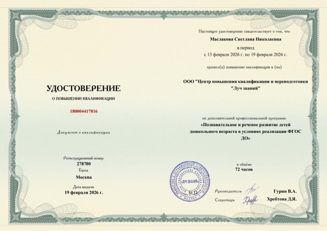 Удостоверение о повышении квалификации "Познавательное и речевое развитие детей дошкольного возраста в условиях реализации ФГОС" |