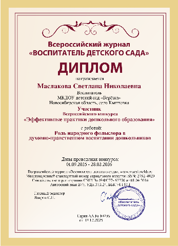 Сертификат участника Всероссийского вебинара "Влияние устного народного творчества на развитие речи дошкольников" |