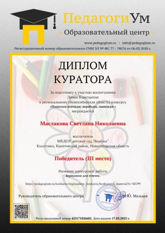 Диплом куратора воспитанника в региональном конкурсе "Помогаем птичкам, воробьям , синичкам" |