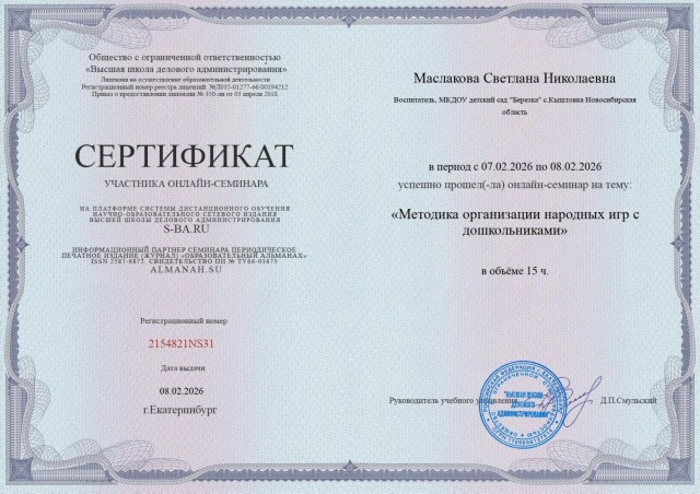 Сертификат участника семинара "Методика организации народных игр с дошкольниками" |