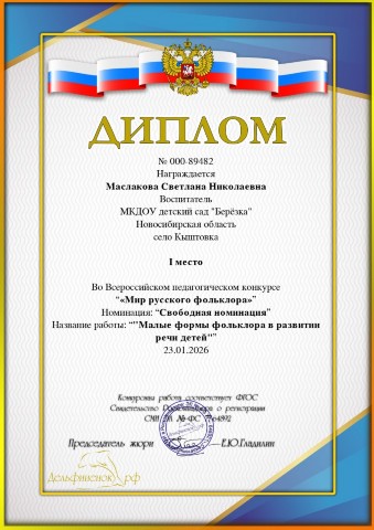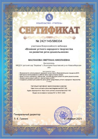 Сертификат участника Всероссийского вебинара "Влияние устного народного творчества на развитие речи дошкольников" |