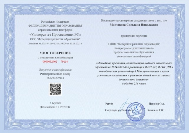 Удостоверение о повышении квалификации"Методики, практики, компетенции педагога дошкольного образования 2024/2025 для реализации ФОП ДО" |