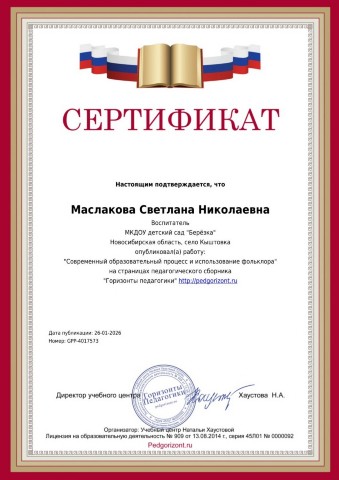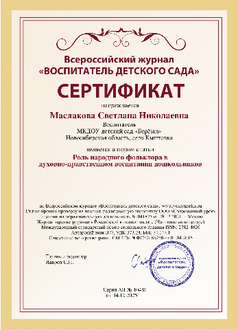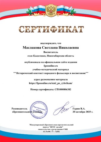 Сертификат о публикации "Исторический контекст народного фольклора в воспитании" |