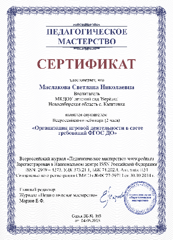 сертификат вебинара "игровая деятельность как механизм развития дошкольника в условиях ФГОС ДО" |