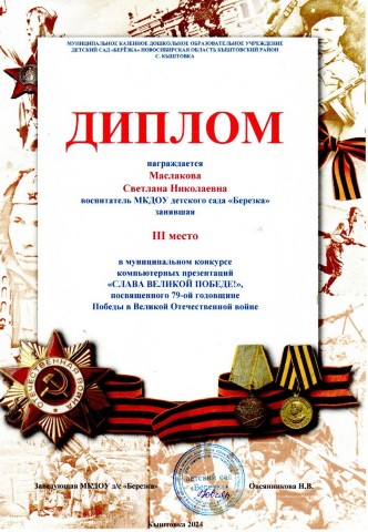 Диплом 3 степени муниципального конкурса презентаций "Слава великой победе" |