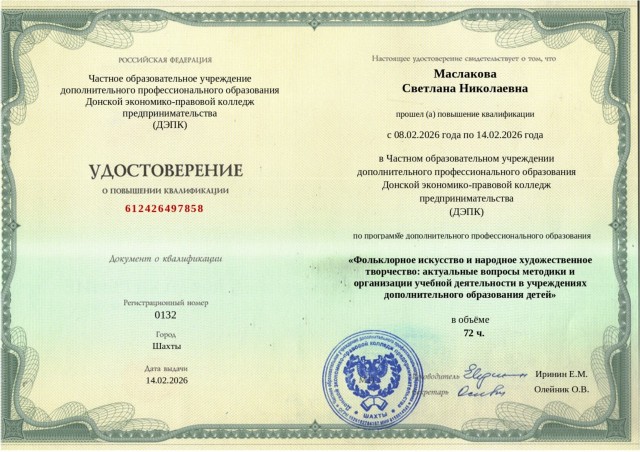 Удостоверение о повышении квалификации "Фольклорное искусство и народное художественное творчество" |