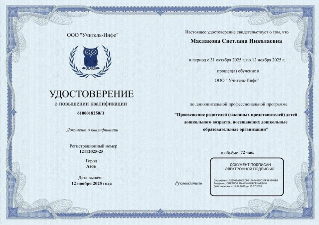 Удостоверение о повышении квалификации"Просвещение родителей (законных представителей) детей дошкольного возраста посещающихдошкольные образовательные организации" |