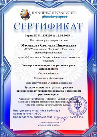 Сертификат участника вебинара "Унивирсальные игры для развития речи дошкольников" |