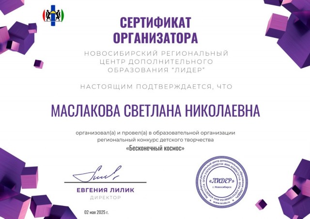 сертификат организатора конкурса детского творчества "Бесконечный космос" |