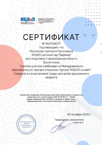 Сертификат вебинара "Создание в семье речевой среды для детей дошкольного возраста" |